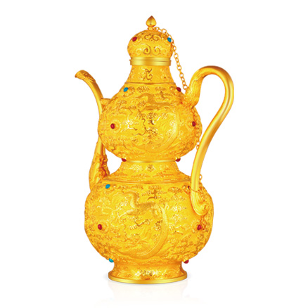 以故宮館藏鏨云龍葫蘆式金執(zhí)壺為原型。整體呈葫蘆形,直口短頸,外撇式圈足,壺身通體鏨刻云紋,云海中鏨二龍戲珠紋,執(zhí)壺有蓋,蓋及壺身鑲嵌寶石共計(jì)32顆。